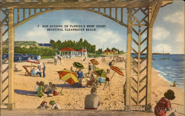 Front: 7 SUN BATHING ON FLORIDA'S WEST COAST. BEAUTIFUL CLEARWATER BEACH. Back: E-4359 al PUBLISHED BY THE HARTMAN CARD CO., PINELLAS PARK, FLORIDA