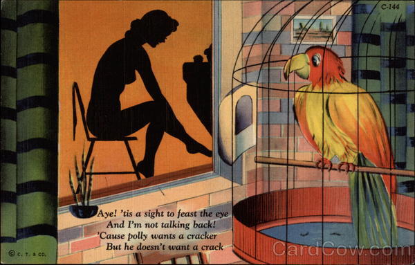 Front: C-144 Aye! 'tis a sight to feast the And I'm not talking back! 'Cause polly wants a cracker But he doesn't want a crack eye С с. т. & со. Back: C. T. SHADOW COMICS-10 SUBJECTS 19305 8 A-H2037