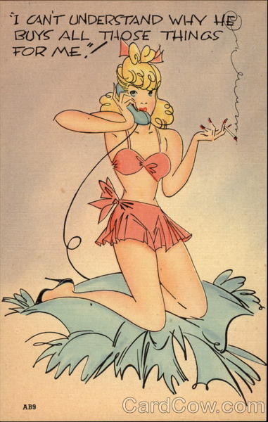 Front: I CANT UNDERSTAND WIY HE BUYS ALL THOSE THINGS FOR ME AB9 Back: MADE IN U. S. A POSTARD AMERICAN BEAUTY SERIES - 10 SUBJECTS 72211