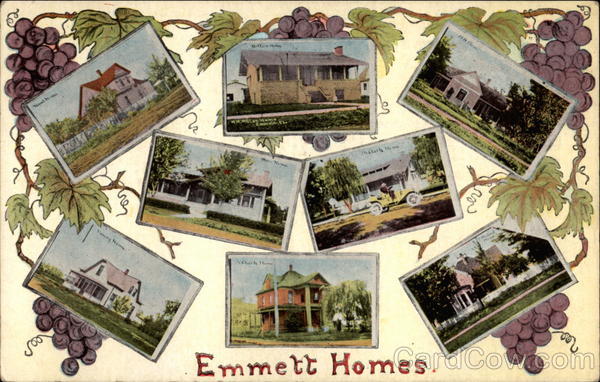 Homes at Emmett, Idaho Emmett is a city of handsome homes. A fair sample of residences may be seen on the other side of this card. There are nine churches, many clubs and organizations, whose social functions are the envy of our less fortunate sister towns. A profusion of luxuriantly flowering shrubbery surrounds many of these homes and the velvety bluegrass lawns are equalled only in the famous bluegrass region of Kentucky. Within a day's dreve of this beautiful city, elk, deer, bear and other big game abound. Water-foul, game birds and mountain trout are plentiful here amid the scenic grandeur of the Rocky Mountains |