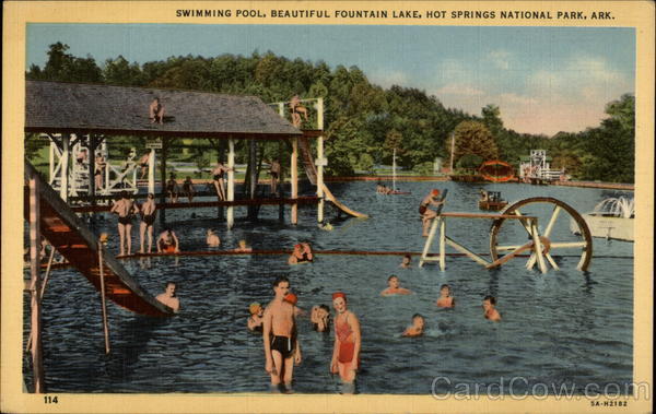 Front: SWIMMING POOL, BEAUTIFUL FOUNTAIN LAKE, HOT SPRINGS NATIONAL PARK, ARK. 華1 114 5A-H2182 Back: WOODCOCK MFG. CO., HOT SPRINGS NATIONAL PARK, ARK.