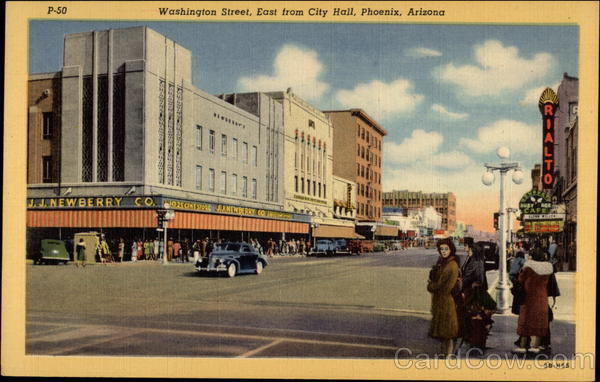Front: P-50 Washington Street, East from City Hall, Phoenix, Arizona 11 111111 auSY SEE CAFE CO.O25 CENT SIORE JMNEWBERRY CO n J.NEWBERRY 3B-H55 ALTO Back: DISTRIBUTED BY LOLLESGARD SPECIALTY CO., TUCSON, ARIZONA PHP