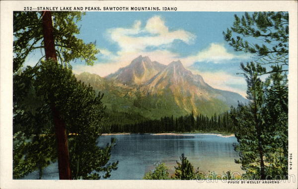 Front: 252-STANLEY LAKE AND PEAKS, SAWTOOTH MOUNTAINS, IDAHO PHOTO BY WESLEY ANDREWS 708-29-N Back: WESLEY ANDREWS CO., PORTLAND, ORE.