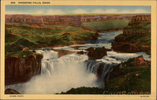 | 460 Bisbee Photo Shoshone Falls, Idaho Located near city of Twin Falls. They are 212 feet high and 1500 feet wide. Upper falls shown are (from left to right) Bridal Veil, Bride's Maid, The Two Graces (in center) and the Sentinel at extreme right and slightly above |