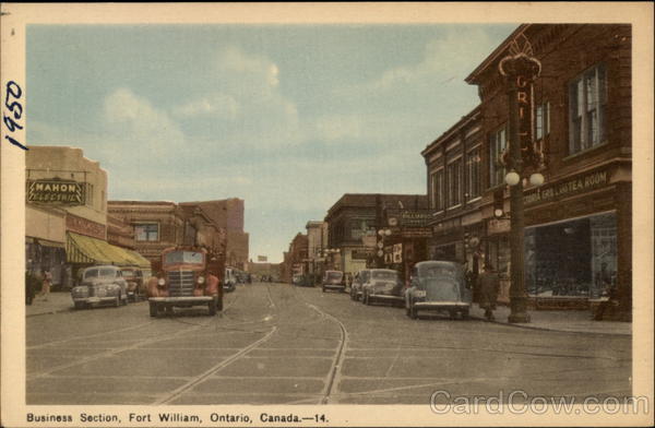 Front: MAHON ELECTRICT CTORIA GRILLAND TEA ROOM BILLIARDS STSHOKES SPAC RESGE E SHE Business Section, Fort William, Ontario, Canada.-14. Back: MADE IN CANADA CARD 1 POSTALE THE PHOTOGELATINE ENGRAVING CO., LTD., TORONTO. BCANADA CARTE