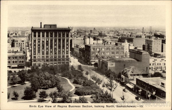 Front: CAPOL THE ATRE ts CAPITOL Birds Eye View of Regina Business Section, looking North, Saskatchewan.-13. Back: CARO 41 MADE IN CANADA PHOTOGELATINE ENGRAVING COLTO OTTAWA CO OTTAWA