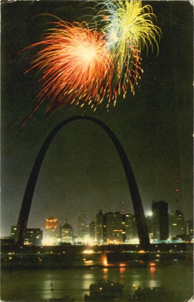 Over a half-million persons are drawn to the riverfronts on both sides of the Mississippi to view the celebration of Independence Day. The Gateway Arch sets the background for this colorful event
