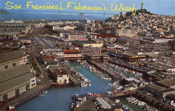 An aerial view of Fisherman's Wharf showing the famous fishing fleet boats at the docks. Oakland Bay Bridge and Yerba Buena Island can be seen in the background