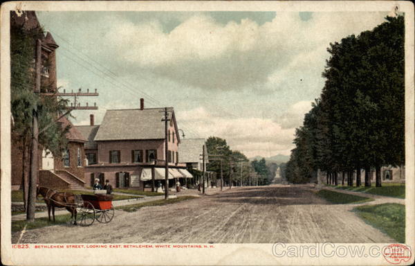 Front: COPYRIGHT 1907. BY DETROIT PUBLISHING CO. IC825. BETHLEHEM STREET. LOOKING EAST, BETHLEHEM, WHITE MOUNTAINS, N. H. Back: I-MS AND CANADA. FOREIGN. TWO "PHOSTINT"CARD. MADE ONLY BY DETROIT PUBLISHING CO. THIS SPACE MAY BE USED FOR MESSAGE.