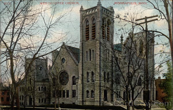 Front: 5113 WESTMINSER CHURCH, MINNEAPOLIS, MINN. Back: Post Caro 24 One Cent for United States, and Island Possessions, Cuba, Canada and For Foreign. A. C. Bosselman & Co.. New York. Published for John T. Faber, Milwaukee, Wis.