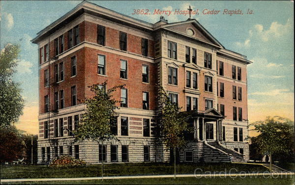 Front: 3862. Mercy Hospral, Cedar Rapids, la. Back: PLACE STAN UNITED STA AND CANAI ONE CEN' FOREIGN, 1 CENTS, Pub. by The Lemograph Co., Chicago, IN. Walalaman 3. FR * JUN 1916 E. P. STRATE WOJU (* 109/03 100 Systag88