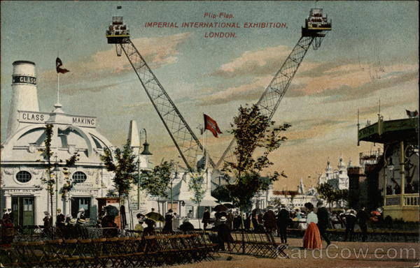 Front: Flip-Flap. IMPERIAL INTERNATIONAL EXHIBITION, LONDON. GLASS CLASS MAKINC W88S FURNACE ENTRANCE TXTYONCW Back: "NATIONAL SERIES. CARD. Here, COLONIAL, AND CERTAIN FOREIGN CORRESPONDENCE BE WRITTEN HERE. Made in Gt. Britain.