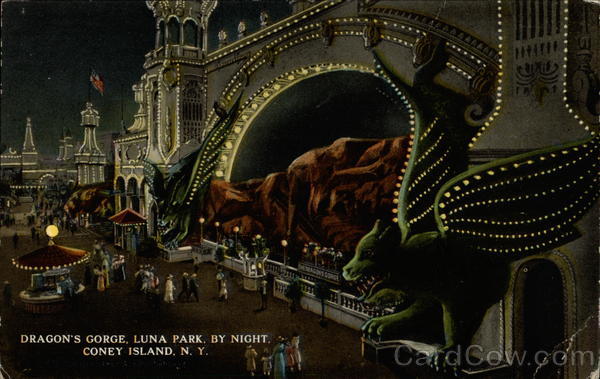 | DRAGON'S GORGE, LUNA PARK, BY NIGHT, Coney Island, N. Y. Luna Park, is the largest private amusement enterprise in Coney Island, containing hundreds of electrical devices and at night is the most brilliantly lighted spot in the Island. Dragon Gorge is one of the largest and most gorgeous concessions in the park |