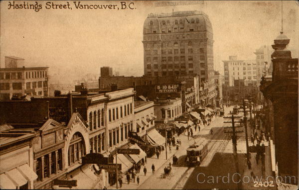 Front: Hastings Street, Vancouver, B.C. 5-10 &15 STORE PROVINCE 2402 Back: 나은 ONES Card 4 PLACE - STAMP-HERE To 2. Pub. by Pacific Novelty Co. of S. F., Cal. Made in S. F.