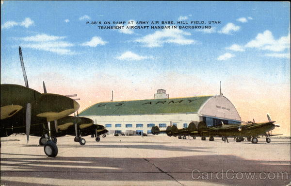 Front: P-38'S ON RAMP AT ARMY AIR BASE, HILL FIELD, UTAH TRANSIENT AIRCRAFT HANGAR IN BACKGROUND Back: 27341 PUB. BY OGDEN NEWS CO., OGDEN, UTAH