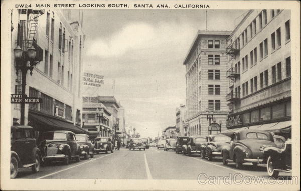 Front: BW24 MAIN STREET LOOKING SOUTH, SANTA ANA, CALIFORNIA RITY-FIRST TTOKALBANK 06 ARGELES ORVI! ATI NERS Back: کے کے no MANUFACTURED BY LONGSHAW CARD CO., LOS ANGELES, CALIF. Ixc