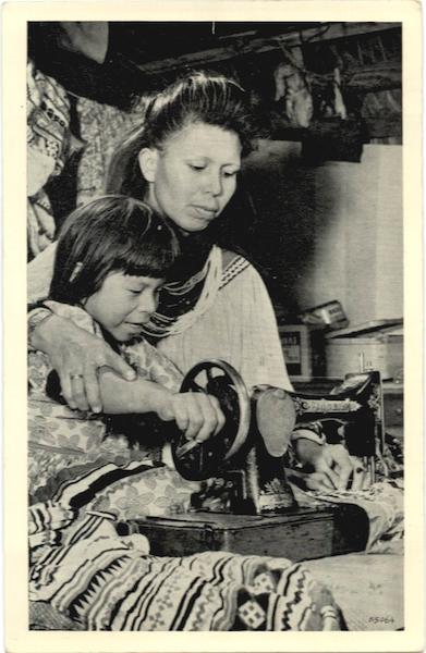 Seminole Indian Trading Post - Alligator and Crocodile Farm-Zoo - Wishing Well and Tropical Gardens - Indian mother teaching daughter to sew their clothing of many colors and tiny pieces - Alligator Wrestling and guided tours hourly