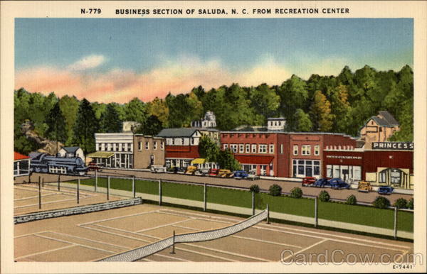 N-779 BUSINESS SECTION OF SALUDA, N. C. FROM RECREATION CENTER PRBBG田日| PRINCES S 8田6 m E-7441