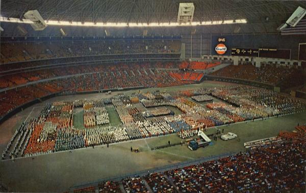 Popular N.B.C. Star, Skitch Henderson, conducts a massed band of 11,000 high school musicians, at halftime of the University of Houston - Chattanooga football game.