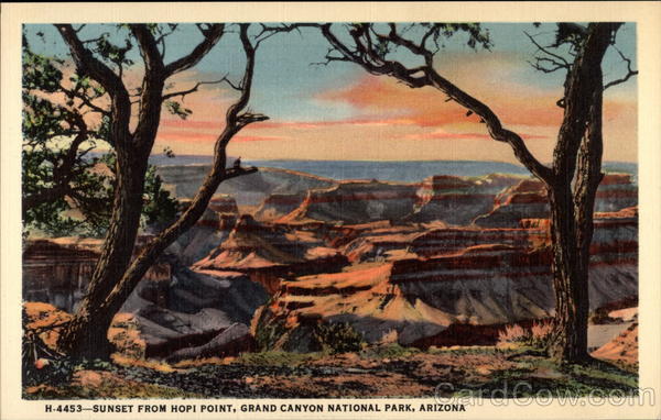 Front: H-4453-SUNSET FROM HOPI POINT, GRAND CANYON NATIONAL PARK, ARIZONA Back: Puedeney The Grand Canyon is the world's most conspicuous example of erosion. From this point one beholds a mighty chasm eleven miles wide and over a mile deep. 7A-H6 86