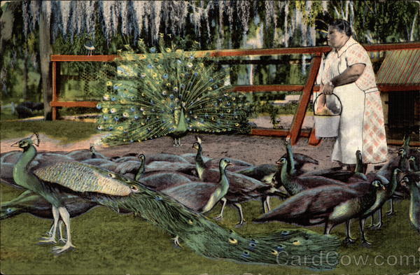 This Peacock Farm is reputed to have the largest collection of all the different kinds of peacocks in the United States. The multi-colored strutting birds and the tropical background present a picture that, for sheer beauty, is unforgettable |
