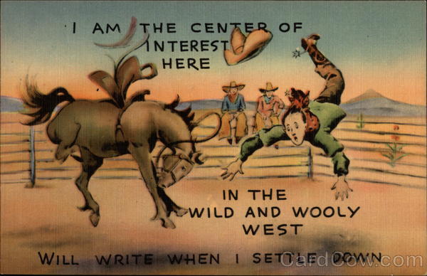 Front: 1. I AM THE CENTER OF NTEREST IN THE WILD AND WOOLY WOOLY WEST WILL WRITE WHEN I SETTLE DOWN Back: M 78: PUB. BY SANDOVAL NEWS CO. - EL PASO - TUCSON NEWS CO. - TUCSON 406