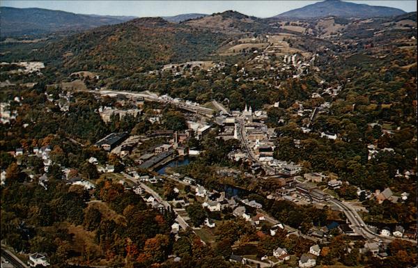 | Birdseye view of Springfield, Vermont, a progressive community at the "Meeting Waters" of the Connecticut and Black Rivers. Located here are some of the world's finest machine tool shops. Here still stands the oldest Vermont School House "Eureka." It was the terminal of the historic military Crown Point Road. Settled 1774 |