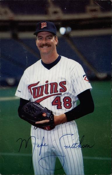 Front: wins 48 mithoon 8th Back: 4 eur MIKE SMITHSON PITCHER BATS LEFT AND THROWS RIGHTHANDED 6'8" 215 LBS. MINNESOTA 1987 MINNESOTA TWINS - BRF PHOTO BY JACK EVENS PARK PRESS, INC. WAITE PARK, MN 100 LACUI BASTO