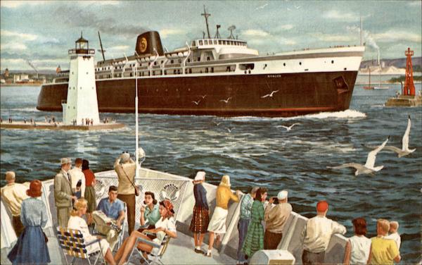 Chessie's water-borne links between Ludington, Michigan and the Wisconsin ports of Milwaukee, Manitowoc and Kewaunee, move 175,000 passengers, 50,000 autos and 100,000 cars of freight annually across Lake Michigan. Vacationists from many states choose C&O's cross lake short cut as pleasant and restful interludes in a busy schedule. C&O's fleet of seven ships operate round the clock every day throughout the year |