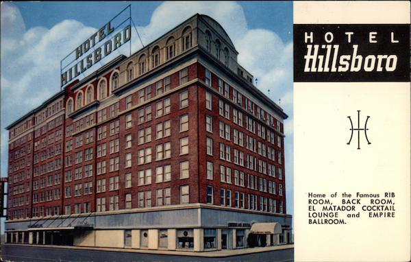 Home of the Famous Rib Room, Back Room, El Matador Cocktail Lounge and Empire Ballroom. Hillsboro Hotel - Tampa's finest - 400 rooms, centrally located - entirely air-conditioned - television - garage - complete convention facilities accommodating 1000 people, and function rooms for weddings, group meetings and civic and industrial groups |