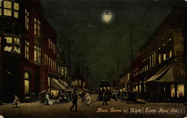 Front: Main Street at Night, Santa Ana, Cal. Back: DHP 5" B. CO and Island Possessions Cuba, Canada and For Foreign. MESSAGE MAY BE WRITTEN ON THIS SIDE. 2805 PUBLISHED BY THE BENHAM CO., LOS ANGELES, CAL. A-11546