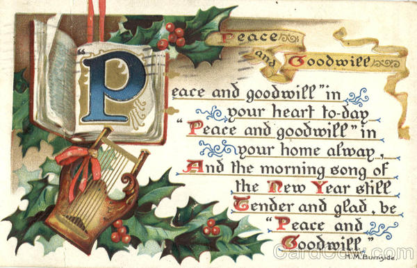 Peace and goodwill in your heart to-day Peace and goodwill in your home always, And the morning song of the New Year Shill Tender and glad, be Peace and Goodwill.