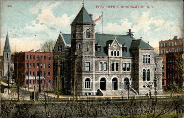 Front: 8446 POST OFFICE, BINGHAMTON, N. Y. WA EHOUSE OF HEF STE SAI SROOM 21-6 Back: Post Caro One Cent for United States, and Island Possessions, Cuba, Canada and For Foreign. A. C, Bosselman & Co., New York, Made in Germany,