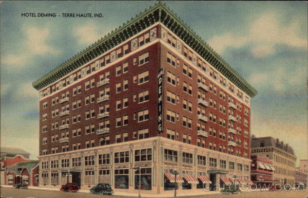 Front: HOTEL DEMING TERRE HAUTE, IND. 44号E 784日 一 ZC 出出8: 出吕吕出吕 出EE8E HHEH日主E Back: HOTEL DEMING 6th and Cherry Sts. TERRE HAUTE, IND. 250 Rooms - Fireproof MWM "COLOR-LITHO" MADE ONLY BY MID-WEST MAP CO., AURORA, MO.