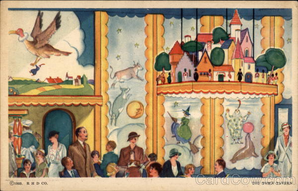 Front: ©1933. R HD CO. TOY TOWN TAVERN Back: A CENTURY OF PROGRESS 131. Toy Town Tavern & SONS CO., CHICAGO DEEPTONE R. R. DONNELLEY COPYRIGHT, 1933, AND PUBLISHED BY THE REUBEN H. DONNELLEY CORPORATION, CHICAGO