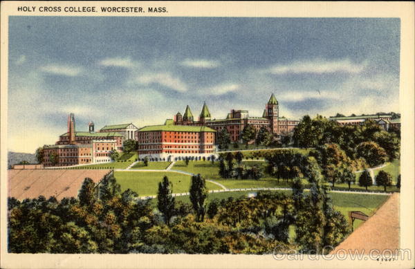 Front: HOLY CROSS COLLEGE. WORCESTER, MASS. 6 3 327 Back: at POST CARE DHP "TICHNOR QUALITY VIEWS" REG. U. S. PAT. OFF. MADE ONLY BY TICHNOR BROS., INC., BOSTON, MASS. PUB, BY PERKINS & BUTLER INC WORCESTER, MASS.