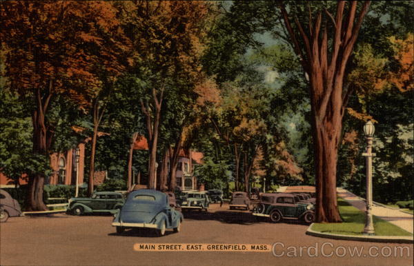 Front: MAIN STREET, EAST, GREENFIELD, MASS. Back: 2 uploh DHP 10350 PUBLISHED BY BARRETT & BAKER, GREENFIELD, MASS. A COLOUR PICTURE PUBLICATION, CAMBRIDGE, MASS., U. S. A.