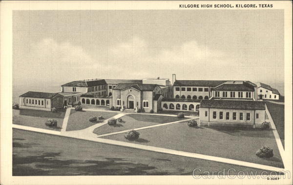 Front: KILGORE HIGH SCHOOL, KILGORE, TEXAS D-3287 Back: "c. T. PHOTO-PLATIN", , MADE ONLY BY CURT TEICH & Co., INC., CHICAGO, U.S.A. ORMSBY'S BOOK STORE, KILGORE, TEXAS