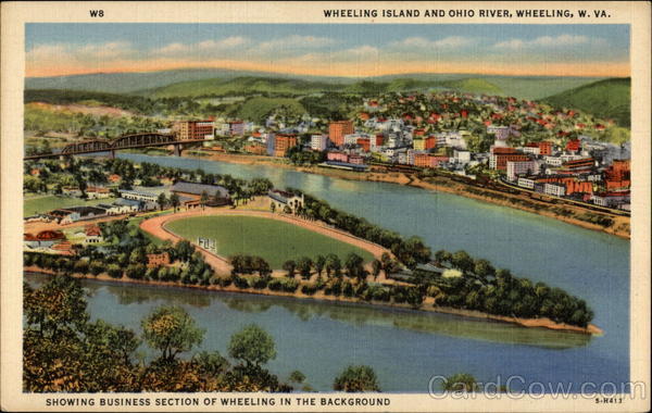 Front: W8 WHEELING ISLAND AND OHIO RIVER, WHEELING, W. VA. SHOWING BUSINESS SECTION OF WHEELING IN THE BACKGROUND 5-H413 Back: PHOTO CRAFTERS, WHEELING, W. VA. Feb, 25;/944 a Brinkley