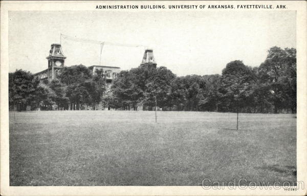 Front: ADMINISTRATION BUILDING, UNIVERSITY OF ARKANSAS, FAYETTEVILLE, ARK. 112595 Back: 1.50 C.T. AMERICAN ART BLACK & WHITE