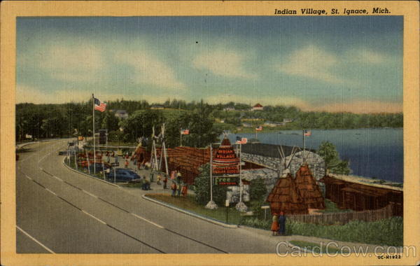 | Located on the spot where the famous missionary, Father Marquette, first landed to establish his St. Ignace Mission among the Chippewas and Ottawas in 1671, the Indian Village offers for sale thousands of articles made by the skilled hands of descendants of these same tribes |