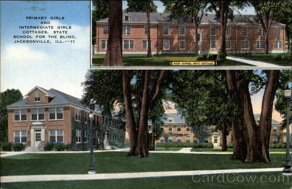 Front: PRIMARY GIRLS INTERMEDIATE GIRLS COTTAGES, SCHOOL FOR THE BLIND, JACKSONVILLE, ILL. 11 HIGH SCHOOL BOYS COTTAGE EEE Back: CO Zeb. 2818345 1944 MADE IN U. S. A. BY E. C. KROPP CO., MILWAUKEE, WIS. (IJF)
