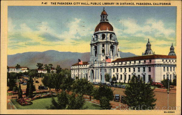 A beautiful edifice in the heart of Pasadena's Civic Center, which houses the directors of the city government. In the distance may be seen Pasadena's twin peaks, Mount Lowe and Mt. Wilson, two of Southern California's chief attractions C.T. Art Colortone |