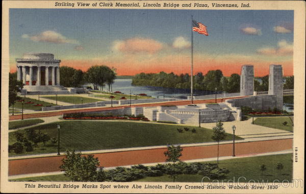 Striking View of Clark Memorial, Lincoln Bridge and Plaza, Vincennes, Ind.