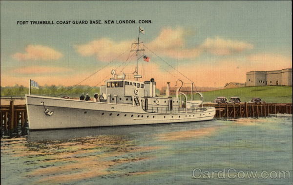 Front: FORT TRUMBULL COAST GUARD BASE, NEW LONDON. CONN. 111 Back: MADE IN U. S. A "TICHNOR QUALITY VIEWS" REG. U.S. PAT, OFF. MADE ONLY BY TICHNOR BROS., INC., BOSTON, MASS. 62073 NEW LONDON NEWS CO., NEW LONDON, CONN,