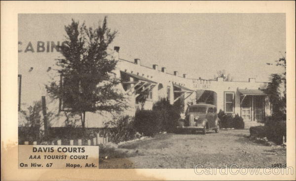 | Davis Court, recommended by AAA. Ultra modern - on U.S. Highway no. 67 1 mile east of Hope, Ark. All cottages strictly modern; innerspring mattresses on all beds. Phone, mail and Western Union service. Owned and operated by Mr. and Mrs. Linus W. Walker. We stopped here |