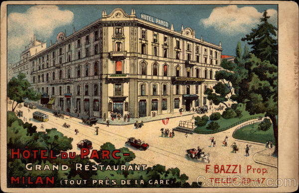 Front: HOTEL PARCO HOTEL PARC HOTEL-DU PARC F BAZZI Prop GRAND RESTAURANT TELEF 29-47 MILAN (TOUT PRES DE LA GARE Back: () STAB FUI PONZINIBIO - MILANO