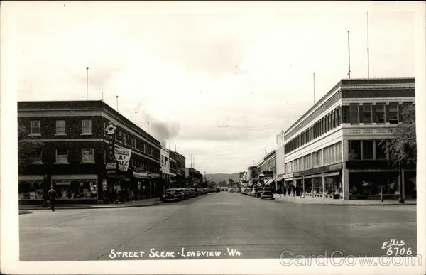 Front: Penall Rexall WEOLL G. OMD CocCola ALE ON xall TRESCRPTIONS ORUCS EEUEI RUE CHESTERFIELD SFLOWERS STREET SCENE·LONGVIEW WN Ellis 6706 Back: lug 10-1950 Crossed Columbia hi ver a few miles from Longview enroute from Seattle to Ra on