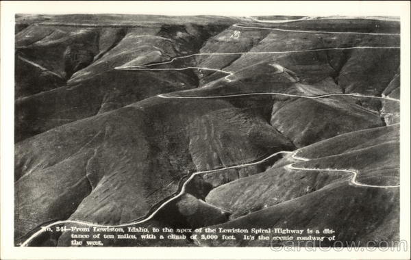 Front: No, 344-From Lewiston, Idaho, to the apex of the Lewiston Spiral Highway is a dis- tance of ten miles, with a clinmb of 2,000 feet. It's the scenio roadway of the west. Back: SGY sood CUVO IS Od OLOHI