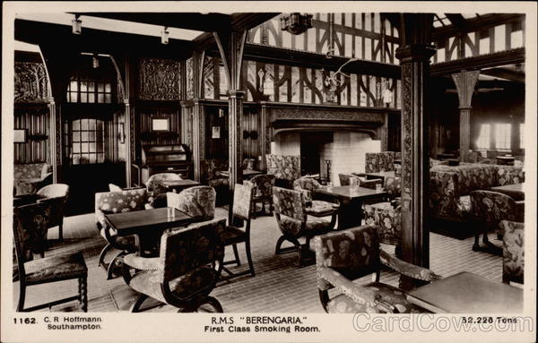 Front: 1162. C. R Hoffmann. Southampton. R.M.S "BERENGARIA." First Class Smoking Room. 52,226 Tons. Back: C. R. Hoffmann, No 1, The Docks, Southampton. This is a "Real Photograph'- BRITISH MANUFACTURE